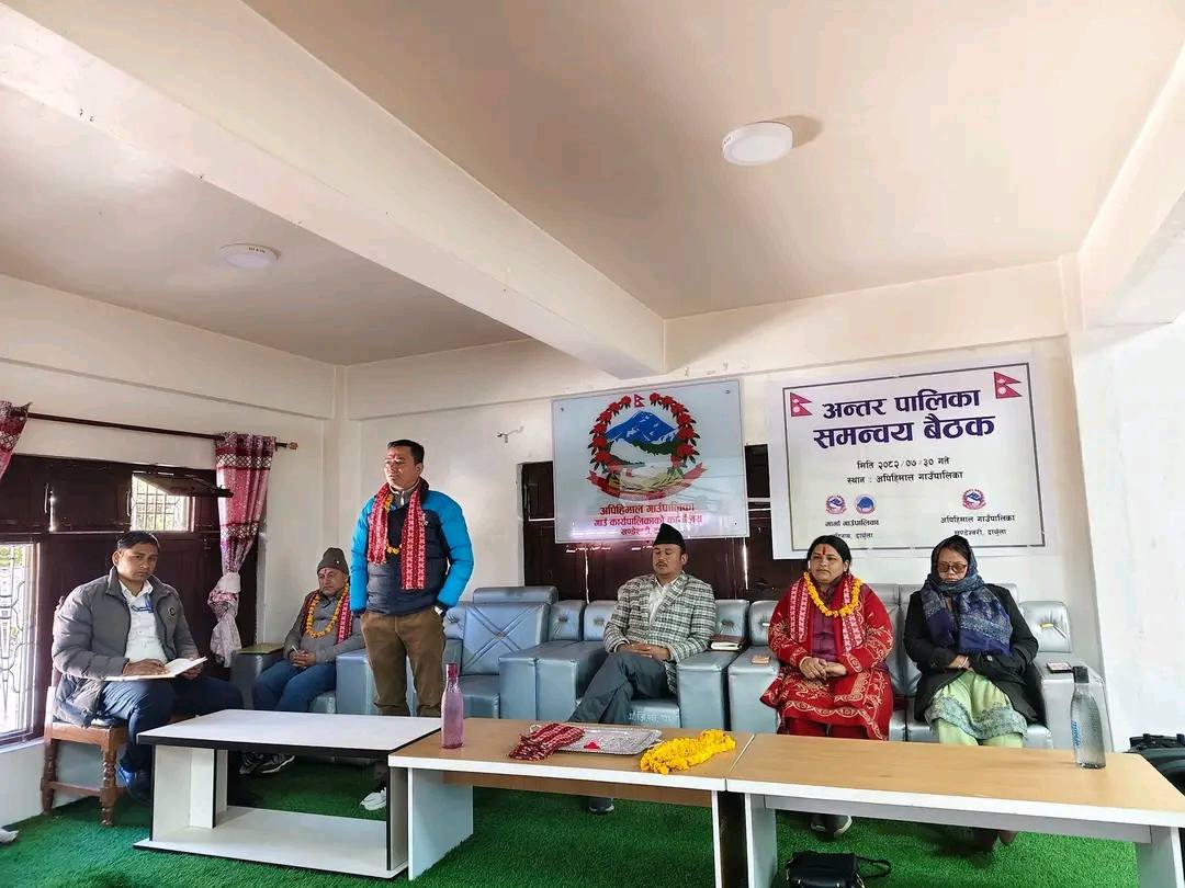 दार्चुला — अपिहिमाल गाउँपालिकाको केन्द्र खण्डेश्वरीमा आइतबार अपिहिमाल र मार्मा गाउँपालिकाबिच अन्तरपालिका समन्वय बैठक सम्पन्न भएको छ। दुवै स्थानीय तहका प्रमुख–उपप्रमुखसहित जनप्रतिनिधि र शाखा प्रमुखहरूको सक्रिय सहभागितामा बैठक सम्पन्न भएको हो। अपिहिमाल गाउँपालिका अध्यक्ष भक्तबहादुर सिंह ठेकरे बोहराको अध्यक्षतामा बसेको बैठकमा मार्मा गाउँपालिका अध्यक्ष जमनसिंह धामी, अपिहिमालकी उपाध्यक्ष देवकी देवी बोहरा, मार्माकी उपाध्यक्ष शर्मिला चन्द सिंह, अपिहिमालका निमित्त प्रमुख प्रशासकीय अधिकृत विरेन्द्र साउद, मार्माका योजना अधिकृत रमेशचन्द्र अवस्थीसहित अन्य प्रतिनिधिहरू सहभागी थिए।