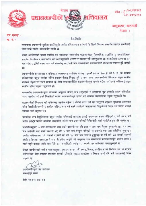 काठमाडौँ – प्रधानमन्त्री सुशीला कार्कीको स्वकीय सचिवालयमा कर्मचारी नियुक्तिसम्बन्धी प्रकाशित–प्रसारित सामग्रीप्रति प्रधानमन्त्री कार्यालयको गम्भीर ध्यानाकर्षण भएको सचिवालयले जनाएको छ। प्रेस संयोजक रामबहादुर रावलले विज्ञप्तिमार्फत ध्यानाकर्षण भएको जनाएका हुन्। प्रधानमन्त्री कार्की मितव्ययिता, पारदर्शिता र जवाफदेहितामा संवेदनशील रहँदै आएको उल्लेख गर्दै सचिवालयमा अत्यन्त न्यून जनशक्तिबाट काम सञ्चालन हुँदै आएको दाबी गरिएको छ।
