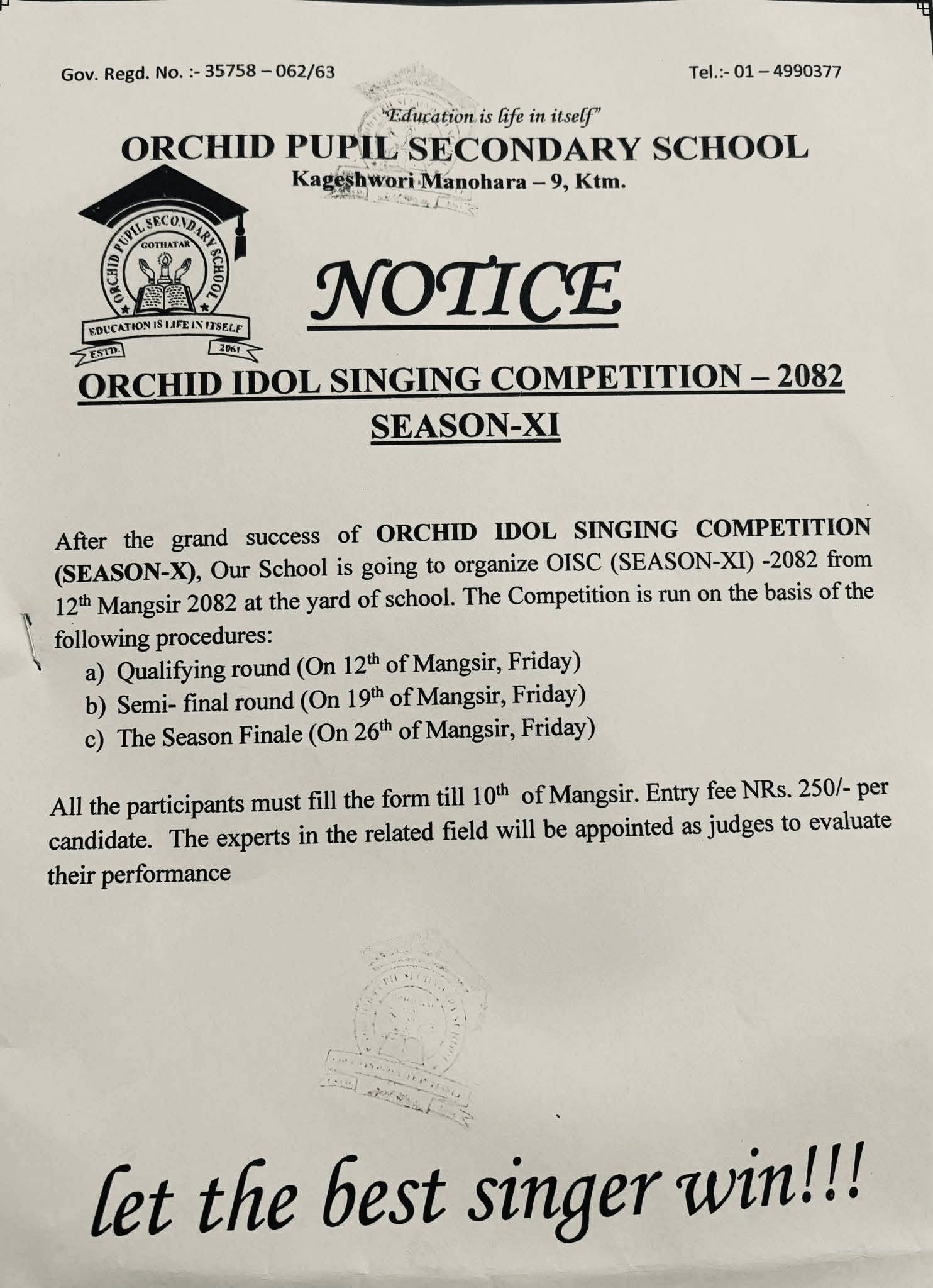 काठमाडौं — अर्किड प्युपल सेकेन्डरी स्कुलले विगतका संस्करणहरूको उल्लेखनीय सफलतापछि यस वर्ष पनि ‘अर्किड आइडल सिङ्गिङ प्रतियोगिता (OISC)–२०८२’ को सिजन–११ भव्य रूपमा आयोजना गर्ने भएको छ। प्रतियोगिता मंसिर १२ गतेदेखि २६ गतेसम्म विद्यालय प्राङ्गणमै सञ्चालन हुनेछ। विद्यालयका संचालक निर्देशक प्रेमकुमार भुजेलले प्रतियोगिताले विद्यार्थीको प्रतिभा, आत्मविश्वास र कलात्मक विकासमा महत्वपूर्ण योगदान पुर्याउने भएकाले यसलाई निरन्तरता दिइएको जानकारी दिए ।