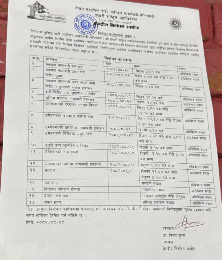 काठमाडौं – नेकपा एमालेको एघारौं महाधिवेशनका लागि केन्द्रीय निर्वाचन आयोगले निर्वाचन कार्यतालिका सार्वजनिक गरेको छ । निर्वाचन आयोगका केन्द्रीय अध्यक्ष डा. विजय सुब्बाले निर्वाचन कार्यतालिका सार्वजनिक गरेका हुन् । जस अनुसार, भोलि (सोमबार) बिहान ७ बजेबाट निर्वाचन कार्यक्रम सुरु हुनेछ । कार्यतालिका अनुसार, पर्सि (मंगलबार) बिहान ७ बजे मतदाता नामावली प्रकाशन गरिनेछ । सोही दिन ८ बजेदेखि ९ बजेसम्म मतदाता नामावलीमा दाबी विरोध, साढे ९ बजे दाबी विरोधको सूचना प्रकाशन, १० बजे दाबी विरोध उपर छानबिन हुनेछ । त्यस्तै, सवा १० बजे अन्तिम मतदाता नामावली प्रकाशन गरिने कार्यतालिकामा उल्लेख छ । मंगलबार दिउँसो ३ देखि ५ बजेसम्म उम्मेदवारको नाम फिर्ता गर्ने कार्यतालिका छ । उम्मेदवारको अन्तिम नामावली प्रकाशन हुने जनाइएको छ । त्यस्तै, पुस १ गते ११ देखि ५ बजेसम्म मतदान हुने कार्यतालिका तय भएको छ ।