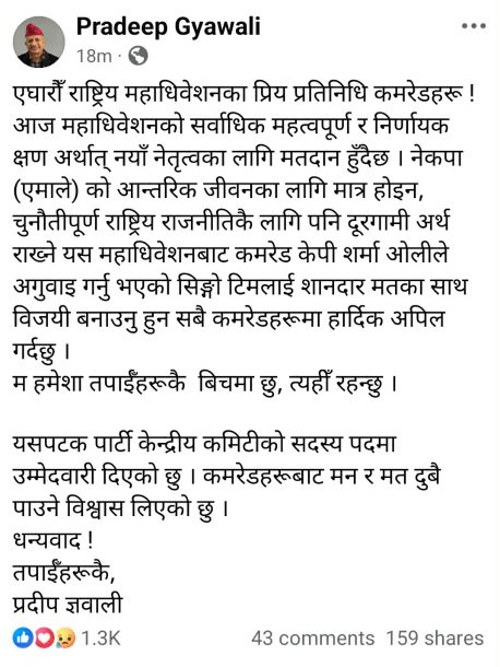 यसै अवसरमा नेता ज्ञवालीले आफू पार्टी केन्द्रीय कमिटी सदस्य पदमा उम्मेदवार रहेको जानकारी गराउँदै प्रतिनिधिहरूबाट मन र मत दुवै पाउने विश्वास व्यक्त गरे । “म सधैँ कमरेडहरूकै बीचमा छु र भविष्यमा पनि त्यहीँ रहनेछु,” भन्दै उनले कार्यकर्ता र प्रतिनिधिसँगको भावनात्मक सम्बन्ध र राजनीतिक प्रतिबद्धता पुनः दोहोर्याए । एमालेको भावी नेतृत्व र आगामी राजनीतिक दिशालाई निर्धारण गर्ने यस निर्णायक मतदानले पार्टीलाई थप एकताबद्ध, सशक्त र जनउत्तरदायी बनाउने विश्वास नेताहरूले व्यक्त गरेका छन् ।