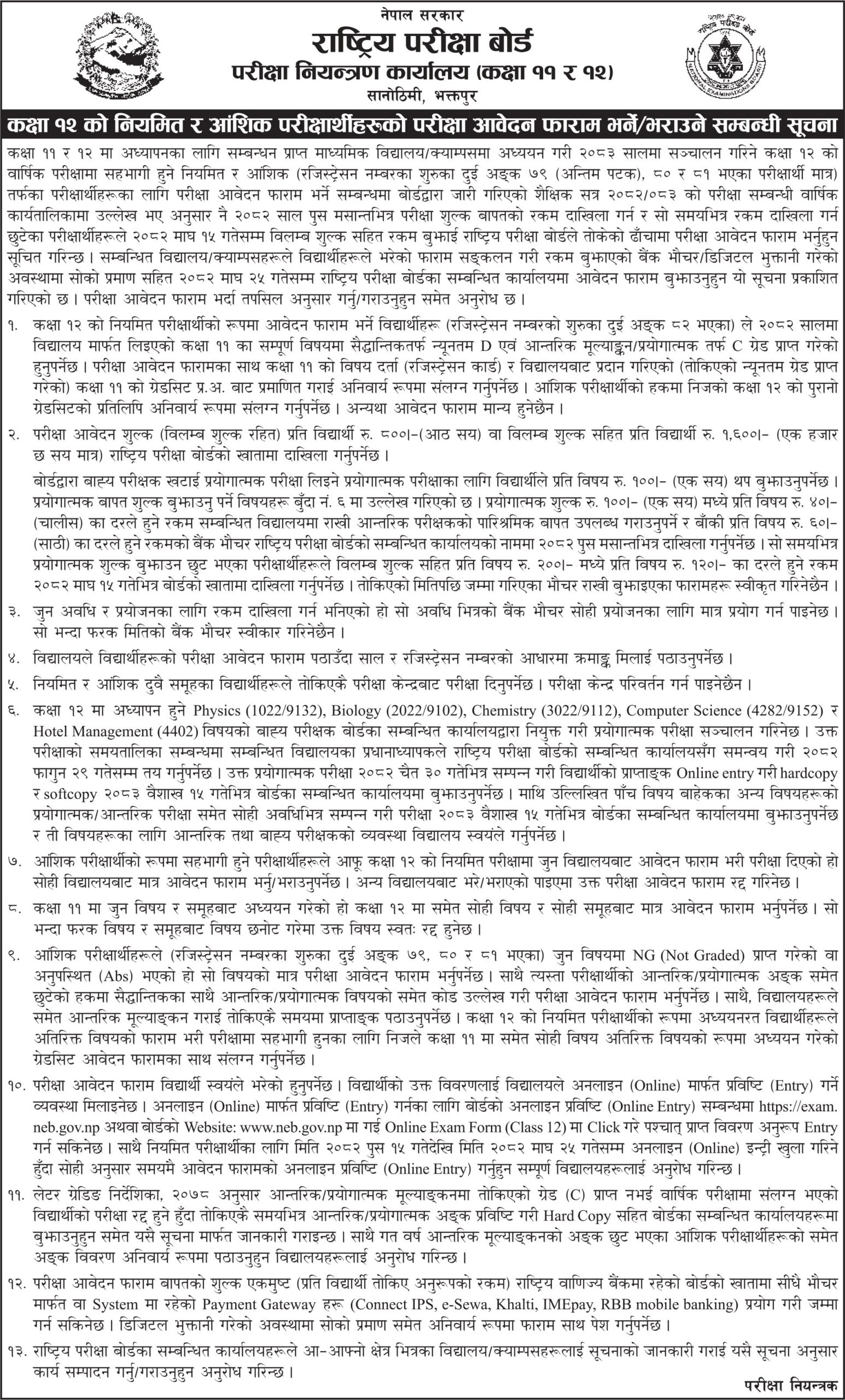 नियमित परीक्षार्थी हुनका लागि कक्षा ११ को सैद्धान्तिकतर्फ न्यूनतम ‘डी’ ग्रेड र आन्तरिक वा प्रयोगात्मकतर्फ ‘सी’ ग्रेड प्राप्त गरेको हुनुपर्ने अनिवार्य सर्त राखिएको छ । विद्यार्थीले फारामका साथमा विद्यालयबाट प्रमाणित कक्षा ११ को ग्रेडसिट र रजिस्ट्रेसन कार्डको प्रतिलिपि पनि बुझाउनुपर्नेछ ।