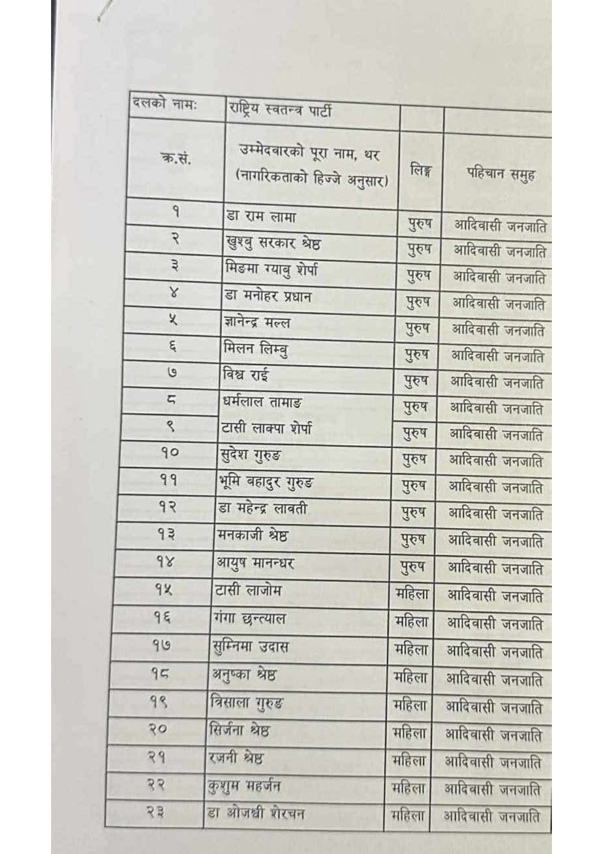 काठमाडौँ – राष्ट्रिय स्वतन्त्र पार्टीले निर्वाचन आयोगमा ११० जना समानुपातिक उम्मेदवारको सूची बुझाएको छ। सोमबार राति बुझाएको सूचीमा चर्चित गायक प्रकाश सपुतदेखि चलचित्र निर्माता आसिफ साह र क्रिकेटर ज्ञानेन्द्र मल्लसम्म समेटिएका छन् । रास्वपाले भर्खरै एकताका लागि सहमति गरेको उज्यालो नेपाल पार्टीले बुझाएको नाम केही नामको रोस्टर पनि यो सूचीमा समेटेको छ । जसअनुसार पार्टी अध्यक्ष अनुपकुमार उपाध्याय, अभिनेत्री रिमा विश्वकर्मा, अभिषेकराज सिंह, डा महेन्द्र लावती, मनीषा कुमारी, सोमप्रसाद चौधरी, सीतादेवी पाण्डे, सरला लामिछाने, दुर्गाबहादुर घिमिरे, बालिका चौधरी रहेका छन् । निर्वाचन आयोगका अनुसार हालसम्म ६४ दलले समानुपातिक उम्मेदवारको बन्द सूची बुझाएका छन् । आइतबार र सोमबार समानुपातिक सूची बुझाउने दिन तोकिएकोमा कुल ६४ दलले बन्द सूची बुझाएको निर्वाचन आयोगले जनाएको छ । आयोगका अनुसार ५४ वटा दलले आ-आफ्नो चुनाव चिह्न कायम रहने गरी सूची बुझाएका छन् । १० वटा दलले भने विभिन्न चार वटा चुनाव चिह्न कायम गरी सूची बुझाएका हुन् । आयोगका अनुसार ६४ दलका ४ हजार ४२४ जना समानुपातिक तर्फ उम्मेदवार कायम भएको छ ।