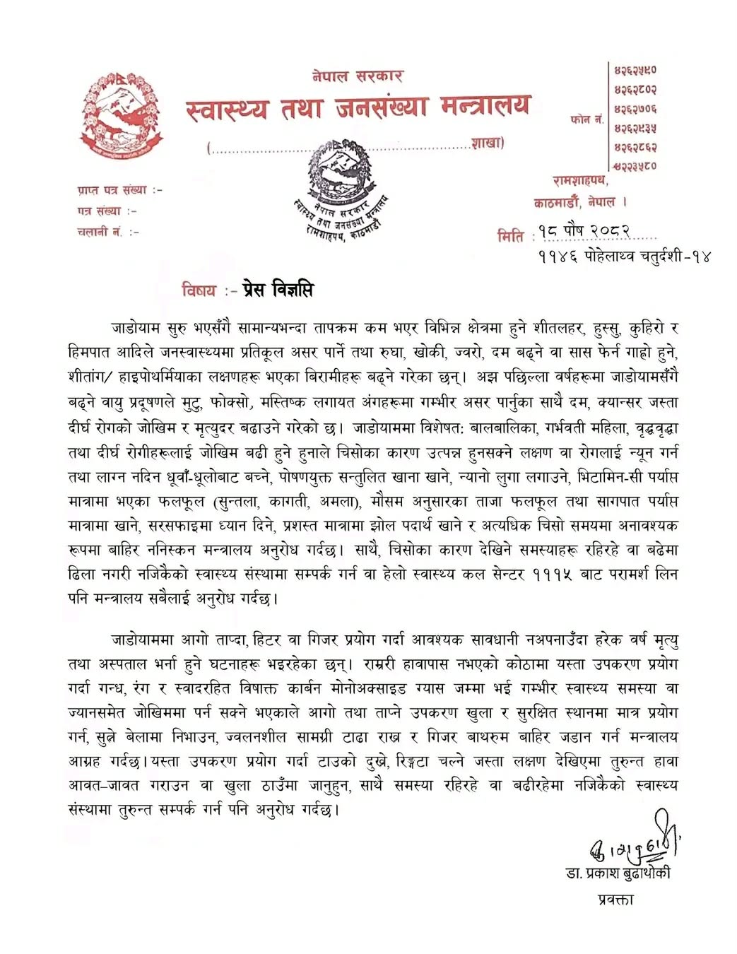 काठमाडौँ – स्वास्थ्य तथा जनसंख्या मन्त्रालयले जाडोयाममा बालबालिका, गर्भवती महिला, वृद्धवृद्धा तथा दीर्घ रोगीहरूलाई अत्यधिक चिसो समयमा अनावश्यक रूपमा बाहिर ननिस्कन अनुरोध गरेको छ । मन्त्रालयले प्रेस विज्ञप्ति जारी गर्दै जाडोयाम सुरु भएसँगै तापक्रम सामान्यभन्दा कम हुने, शीतलहर, हुस्सु, कुहिरो तथा हिमपातजस्ता मौसमी अवस्थाले जनस्वास्थ्यमा प्रतिकूल असर पार्ने भएकाले जोखिम समूहका व्यक्तिहरूलाई विशेष सतर्कता अपनाउन आग्रह गरेको हो ।विज्ञप्तिमा चिसोका कारण रुघाखोकी, ज्वरो, दम बढ्ने, सास फेर्न गाह्रो हुने तथा शीताङ्ग (हाइपोथर्मिया) का लक्षण देखिने बिरामीहरूको संख्या बढ्ने उल्लेख गरिएको छ । यस्तै पछिल्ला वर्षहरूमा जाडोयामसँगै बढ्ने वायु प्रदूषणले मुटु, फोक्सो र मस्तिष्कलगायत अंगहरूमा गम्भीर असर पार्नुका साथै दम, क्यान्सरजस्ता दीर्घ रोगको जोखिम र मृत्युदरसमेत बढाएको मन्त्रालयले जनाएको छ ।