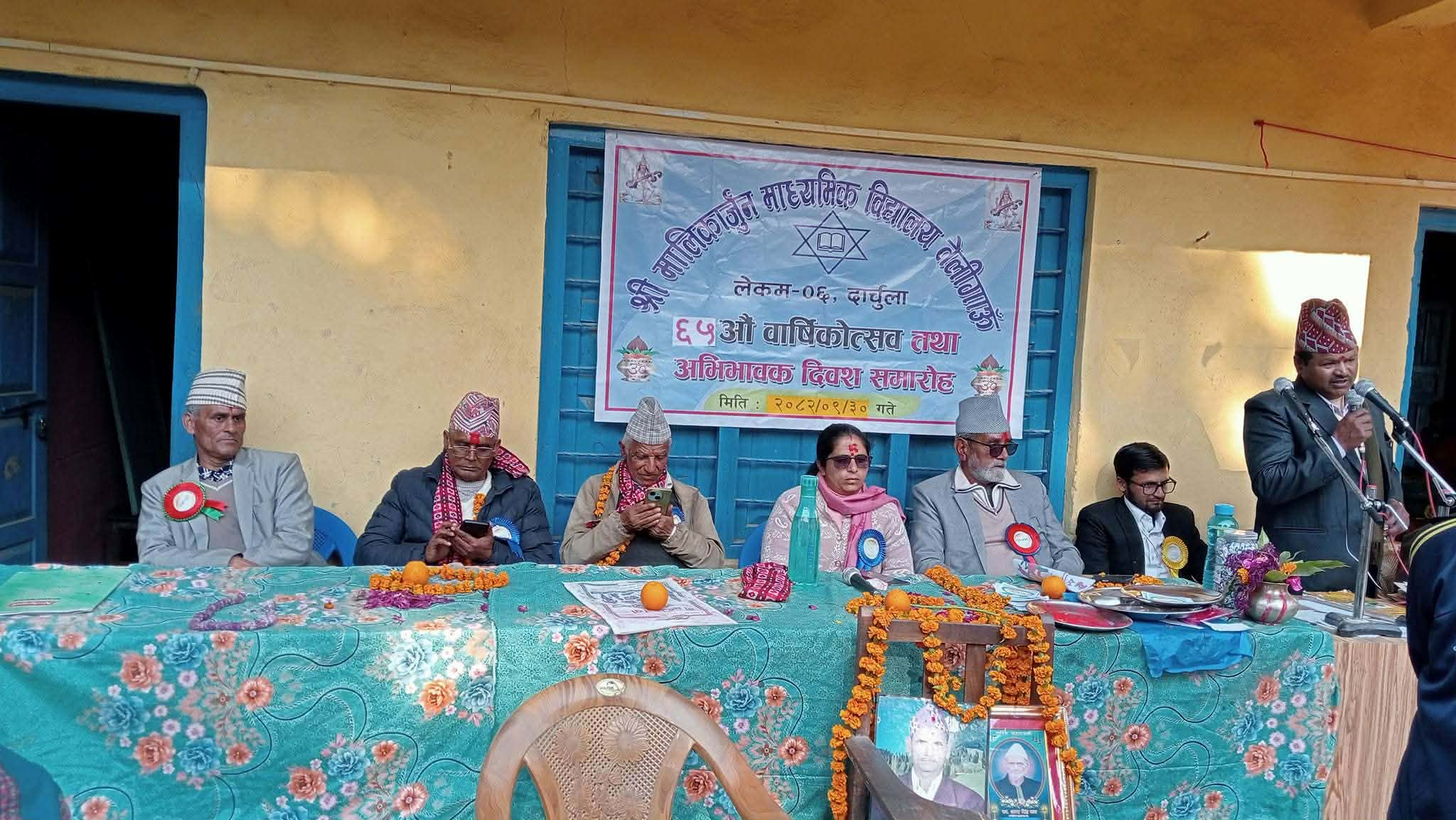 दार्चुला – लेकम गाउँपालिका वडा नं. ६ तेलिगाउँमा रहेको श्री मालिकार्जुन माध्यमिक विद्यालयको ६५ औँ वार्षिकोत्सव तथा अभिभावक दिवस आज विविध कार्यक्रमका साथ सम्पन्न भएको छ । विद्यालय व्यवस्थापन समिति अध्यक्ष हरिनन्दन नाथको अध्यक्षतामा तथा लेकम गाउँपालिका अध्यक्ष रामदत्त जोशीको प्रमुख आतिथ्यमा कार्यक्रम सम्पन्न भएको हो। कार्यक्रममा गाउँपालिका उपाध्यक्ष माधवी जोशी, पूर्व उपाध्यक्ष परमानन्द जोशी, वडा नं. ६ का पूर्व वडा अध्यक्ष कमलापती मिश्र, जनप्रतिनिधि, शिक्षक, अभिभावक तथा विद्यार्थीहरूको उल्लेखनीय उपस्थिति रहेको थियो । कार्यक्रमलाई सम्बोधन गर्दै गाउँपालिका अध्यक्ष जोशीले गत शैक्षिक सत्रदेखि विद्यालय समायोजनपछि नयाँ नेतृत्व आएपछि विद्यालयको शैक्षिक, व्यवस्थापकीय तथा भौतिक विकासमा उल्लेखनीय सुधार हुँदै गएको बताउनुभयो। शिक्षकहरूको लगनशीलता र अभिभावकको सहकार्यका कारण शिक्षाको गुणस्तर क्रमशः बढ्दै गएको उहाँको भनाइ थियो । विद्यालय समायोजनपछि नयाँ प्रधानाध्यापकका रूपमा नियुक्त श्री विजय राज मिश्रले विद्यालयको वार्षिक प्रगति तथा आय–व्यय विवरण सार्वजनिक गर्नुभयो। उहाँले विद्यालयको समग्र सुधारका लागि निरन्तर प्रयास जारी रहने प्रतिबद्धता व्यक्त गर्नुभयो ।