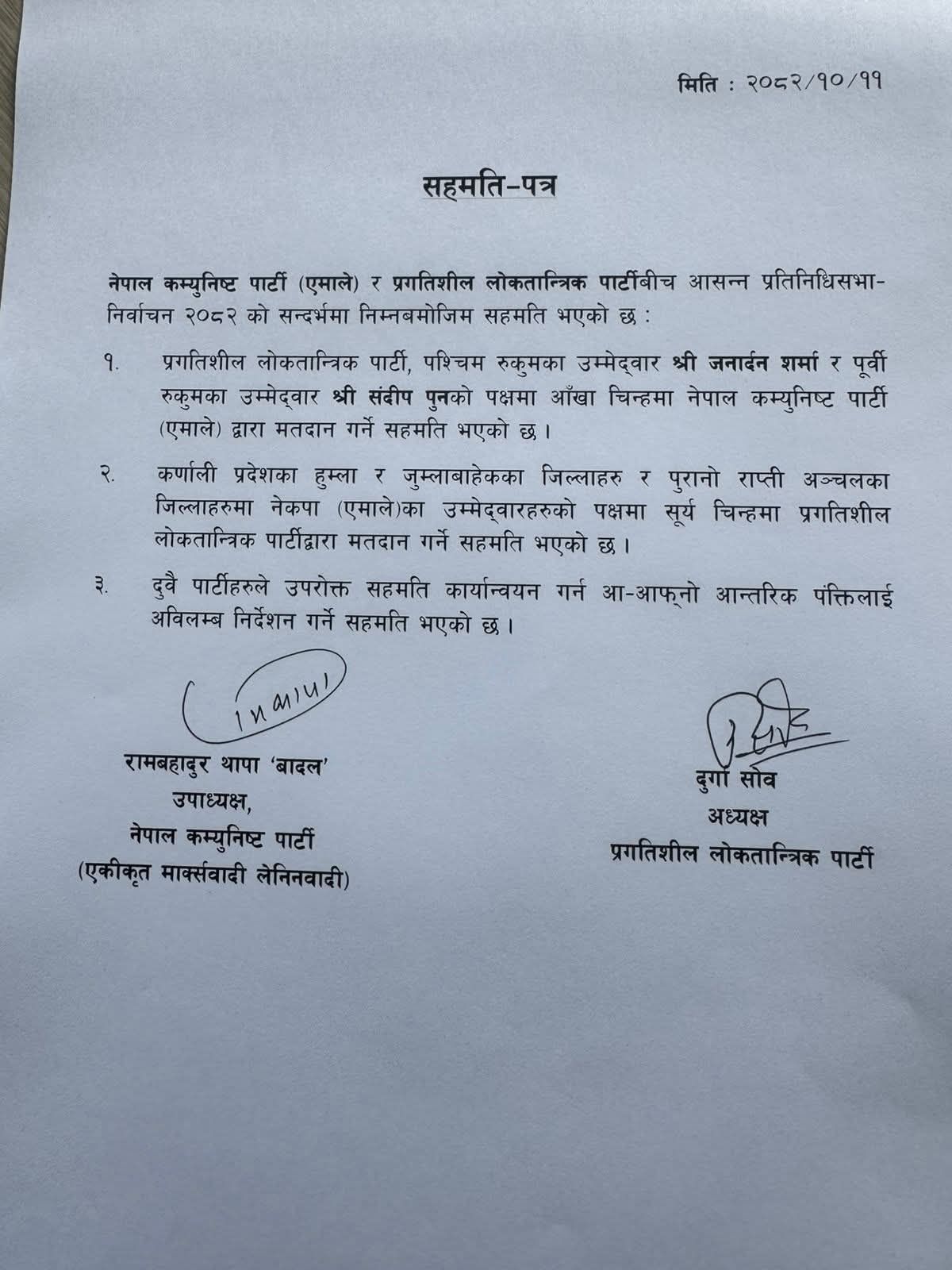काठमाडौं – आसन्न प्रतिनिधिसभा निर्वाचनमा रुकुम पूर्व र पश्चिममा नेकपा एमालेले प्रगतिशिल लोकतान्त्रिक पार्टी (प्रलोपा) लाई सघाउने भएको छ । एमाले उपाध्यक्ष रामबहादुर थापा बादल र प्रलोपा अध्यक्ष दुर्गा सोवबीच आइतबार सहमतिपत्रमा हस्ताक्षर भएको छ । रुकुम पश्चिममा प्रलोपाको तर्फबाट जनार्दन शर्मा उम्मेदवार छन् भने पूर्वमा संदिप पुन उम्मेदवार छन् । प्रलोपाको चुनाव चिन्ह आँखा हो । एमालेले आँखामै मतदान गर्ने सहमति भएको जारी विज्ञप्तिमा उल्लेख छ ।