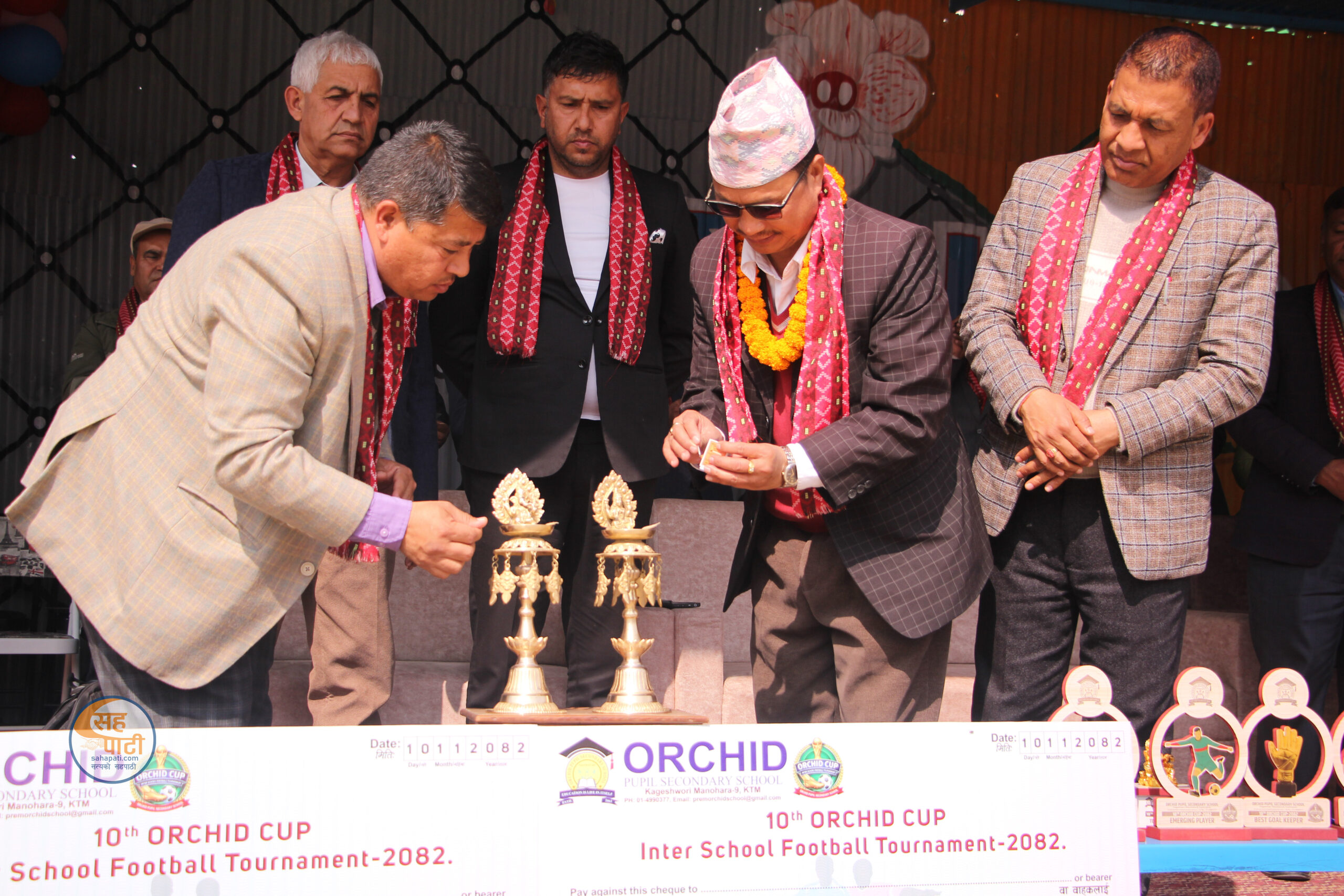 काठमाडौं । काठमाडौँको गोठाटारमा अवस्थित अर्किड प्युपल सेकेन्डरी स्कुलको आयोजनामा १०औँ ‘अर्किड कप’ सेभेन ए साइड अन्तरविद्यालय जुनियर छात्र फुटबल प्रतियोगिताको आज भव्य उद्घाटनसँगै औपचारिक रूपमा सुरुवात गरिएको छ । प्रतियोगिताको उद्घाटन समारोहका प्रमुख अतिथि नेपालको वर्तमान राष्ट्रिय गानका रचनाकार प्रदीप राई रहेका थिए । उद्घाटन सत्रको सभाध्यक्ष विद्यालयका संस्थापक तथा सञ्चालक प्रेमकुमार भुजेल ले गरेका थिए । कार्यक्रममा नेसनल प्याब्सन काठमाडौंका अध्यक्ष अमृत खड्का, उपाध्यक्षहरू, सहसचिव प्राप्ति मल्ल, नेरिक एकेडेमीका प्रिन्सिपल मिलन केसी, विश्वज्ञान पाठशालाका प्रिन्सिपल मातृका कार्की लगायत विभिन्न विद्यालयका संस्थापक तथा प्रिन्सिपलहरूको उल्लेखनीय उपस्थिति रहेको थियो ।