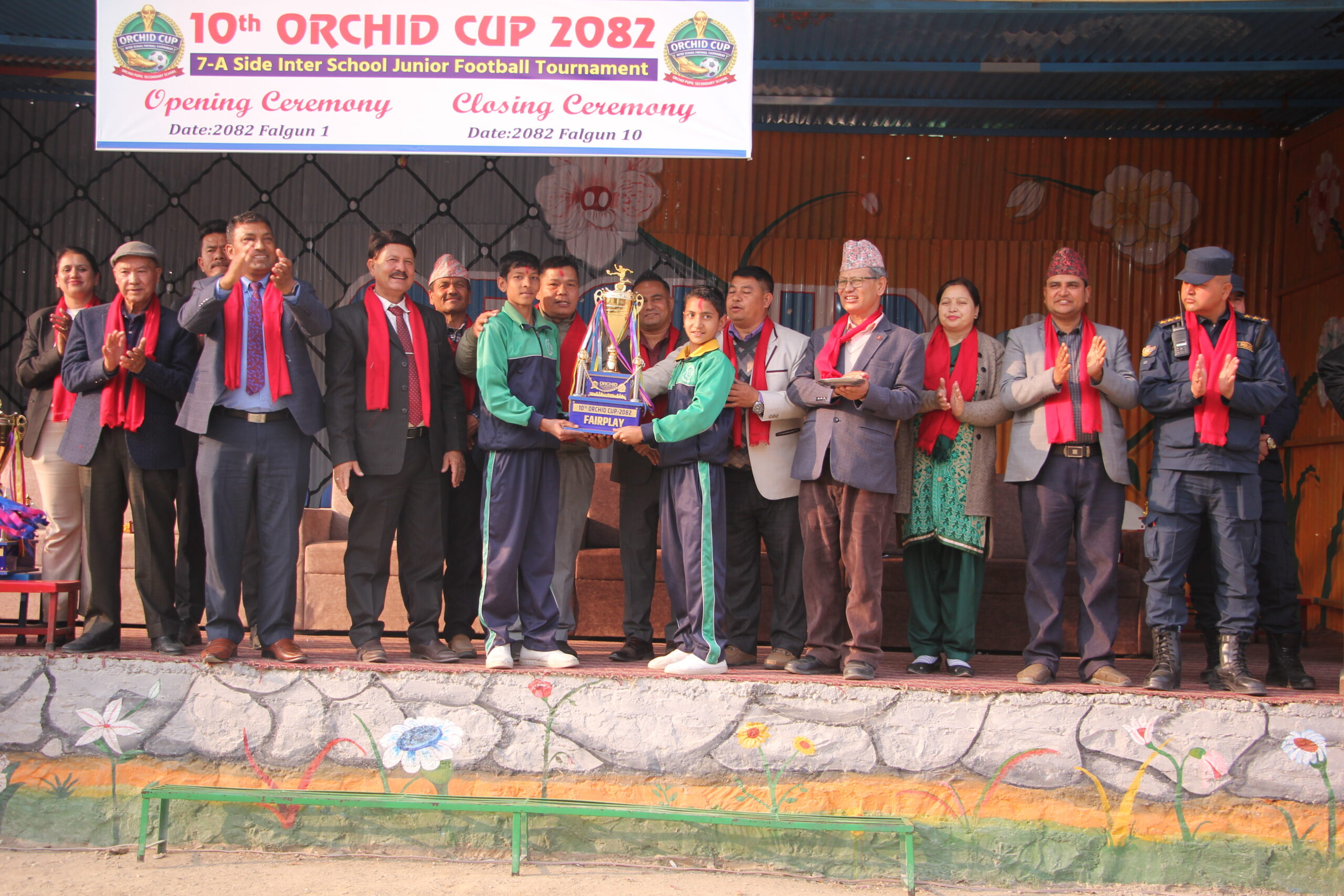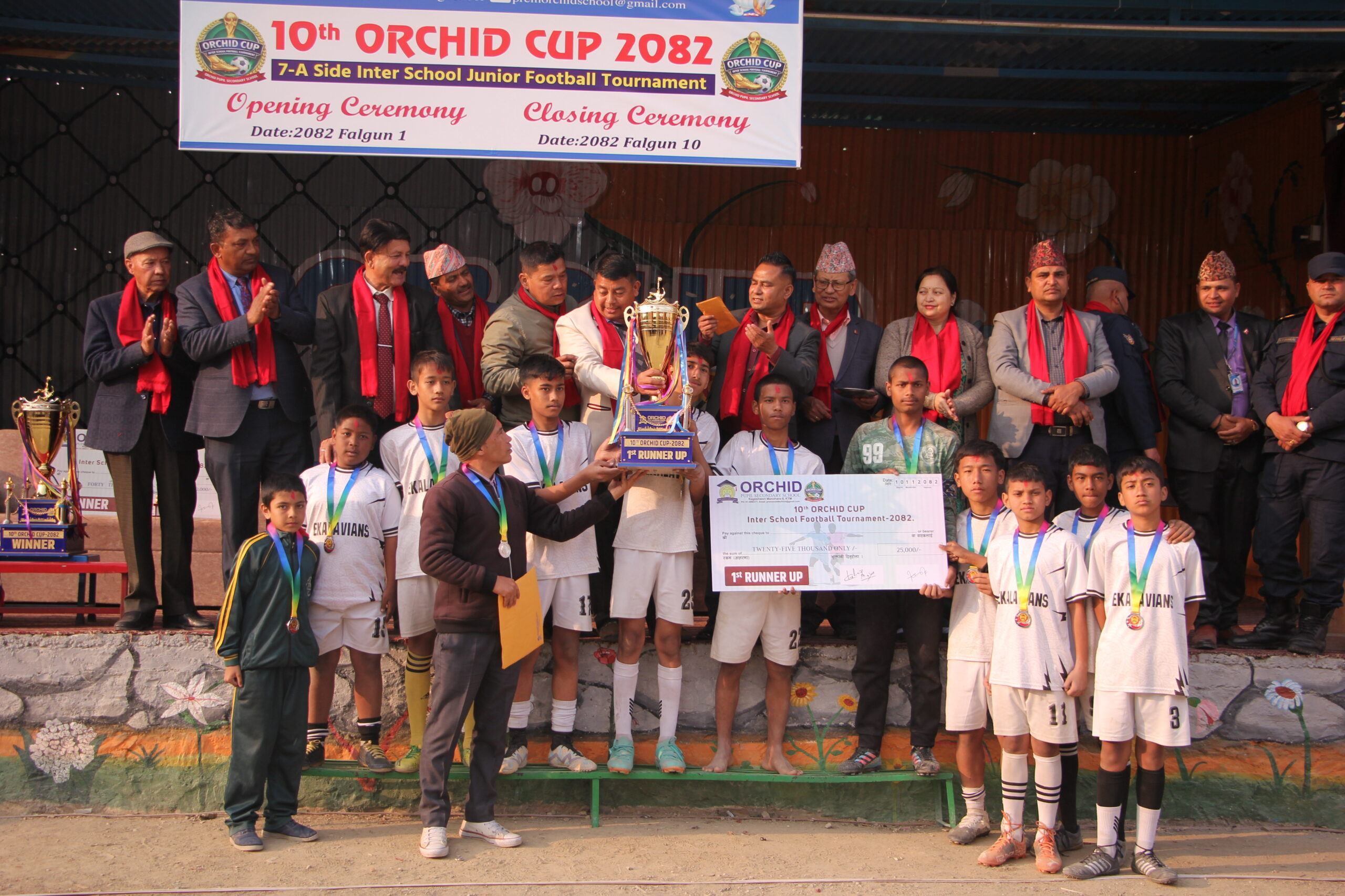 काठमाडौँ । गोठाटारस्थित अर्किड प्युपल सेकेन्डरीको आयोजनामा सञ्चालन भएको विद्यालयस्तरीय ‘अर्किड कप’ फुटबल प्रतियोगिताको उपाधि विद्यावाणी स्कुलले जितेको छ । रोमाञ्चक फाइनल खेलमा विद्यावाणीले एकलव्य स्कुललाई ५–४ गोल अन्तरले पराजित गर्दै ट्रफी उचालेको हो । निर्धारित समयमा खेल बराबरीमा सकिएपछि पेनाल्टी सुटआउटमार्फत जित–हारको टुंगो लागेको थियो । खेल अवधिभर दुवै टोलीले उत्कृष्ट प्रदर्शन गर्दै दर्शकलाई भरपुर मनोरञ्जन दिएका थिए। उपविजेतामा सीमित भएको एकलव्य स्कुलले दोस्रो स्थानमा चित्त बुझायो । यस्तै, विद्या विकास तेस्रो र निर्मल ज्योती चौथो स्थान हासिल गर्न सफल भए । फेयर प्ले अवार्ड भने एजीएम स्कुलले हात पारेको आयोजकले जनाएको छ । प्रतियोगितामा कूल ४६ विद्यालयको सहभागिता रहेको थियो । फागुन १ गतेबाट सुरु भएको प्रतियोगिता आज सम्पन्न भएको हो । समापन समारोहमा विजेता टोलीलाई नगद पुरस्कारसहित मेडल र प्रमाणपत्र प्रदान गरिएको थियो । विजेताले ४० हजार रुपैयाँ, उपविजेताले २५ हजार रुपैयाँ, तेस्रो हुने टोलीले १५ हजार रुपैयाँ र चौथो स्थान हासिल गर्ने टोलीले १० हजार रुपैयाँ नगद पुरस्कार प्राप्त गरेका छन् ।