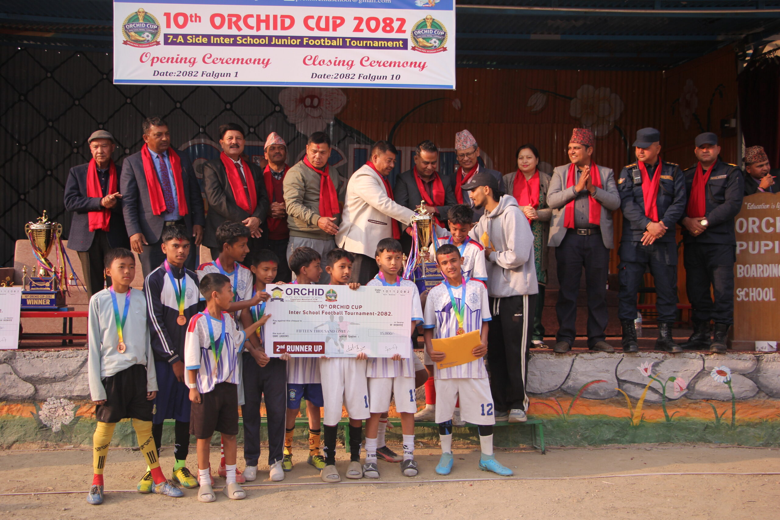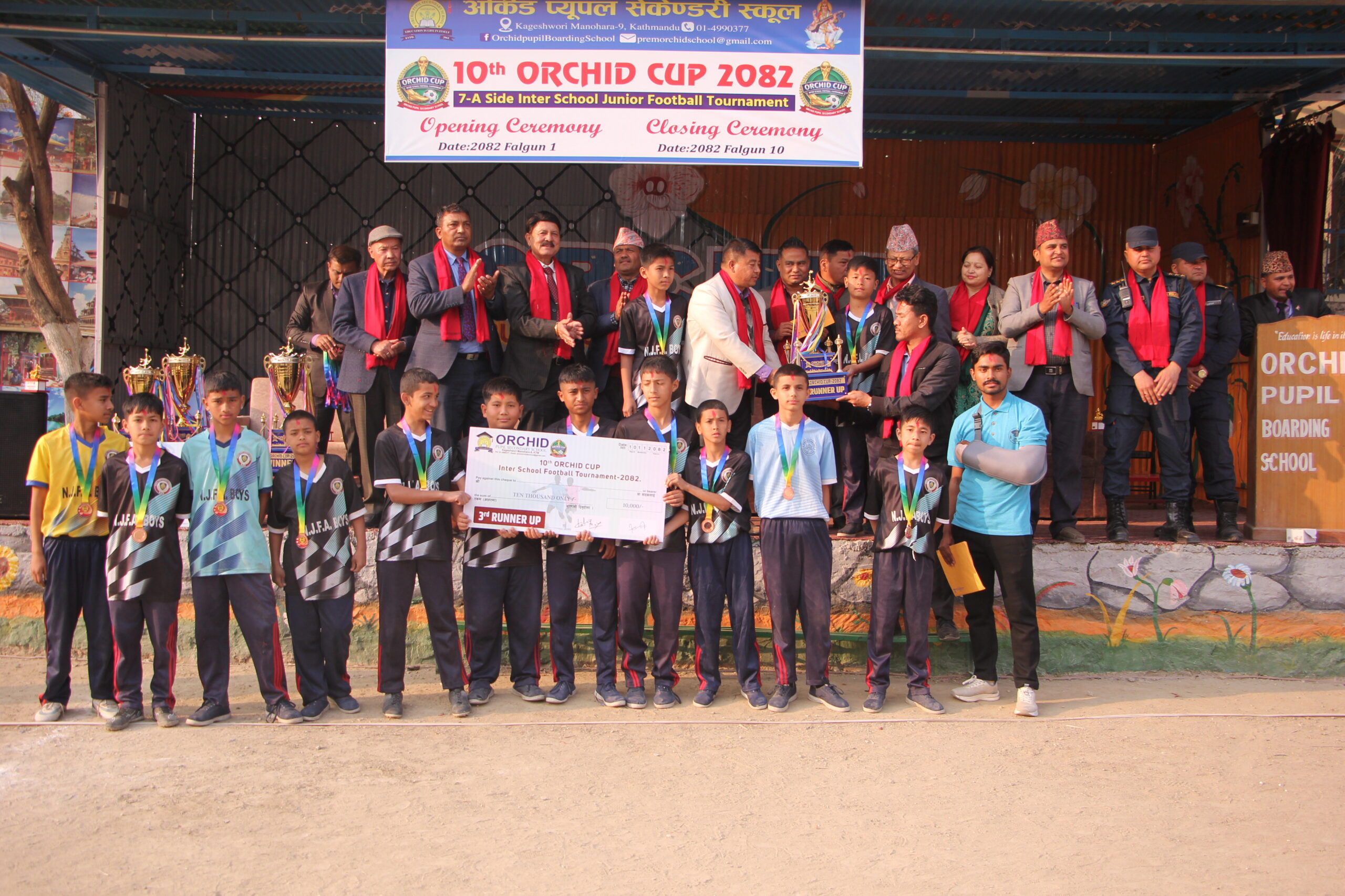 काठमाडौँ । गोठाटारस्थित अर्किड प्युपल सेकेन्डरीको आयोजनामा सञ्चालन भएको विद्यालयस्तरीय ‘अर्किड कप’ फुटबल प्रतियोगिताको उपाधि विद्यावाणी स्कुलले जितेको छ । रोमाञ्चक फाइनल खेलमा विद्यावाणीले एकलव्य स्कुललाई ५–४ गोल अन्तरले पराजित गर्दै ट्रफी उचालेको हो । निर्धारित समयमा खेल बराबरीमा सकिएपछि पेनाल्टी सुटआउटमार्फत जित–हारको टुंगो लागेको थियो । खेल अवधिभर दुवै टोलीले उत्कृष्ट प्रदर्शन गर्दै दर्शकलाई भरपुर मनोरञ्जन दिएका थिए। उपविजेतामा सीमित भएको एकलव्य स्कुलले दोस्रो स्थानमा चित्त बुझायो । यस्तै, विद्या विकास तेस्रो र निर्मल ज्योती चौथो स्थान हासिल गर्न सफल भए । फेयर प्ले अवार्ड भने एजीएम स्कुलले हात पारेको आयोजकले जनाएको छ । प्रतियोगितामा कूल ४६ विद्यालयको सहभागिता रहेको थियो । फागुन १ गतेबाट सुरु भएको प्रतियोगिता आज सम्पन्न भएको हो । समापन समारोहमा विजेता टोलीलाई नगद पुरस्कारसहित मेडल र प्रमाणपत्र प्रदान गरिएको थियो । विजेताले ४० हजार रुपैयाँ, उपविजेताले २५ हजार रुपैयाँ, तेस्रो हुने टोलीले १५ हजार रुपैयाँ र चौथो स्थान हासिल गर्ने टोलीले १० हजार रुपैयाँ नगद पुरस्कार प्राप्त गरेका छन् ।