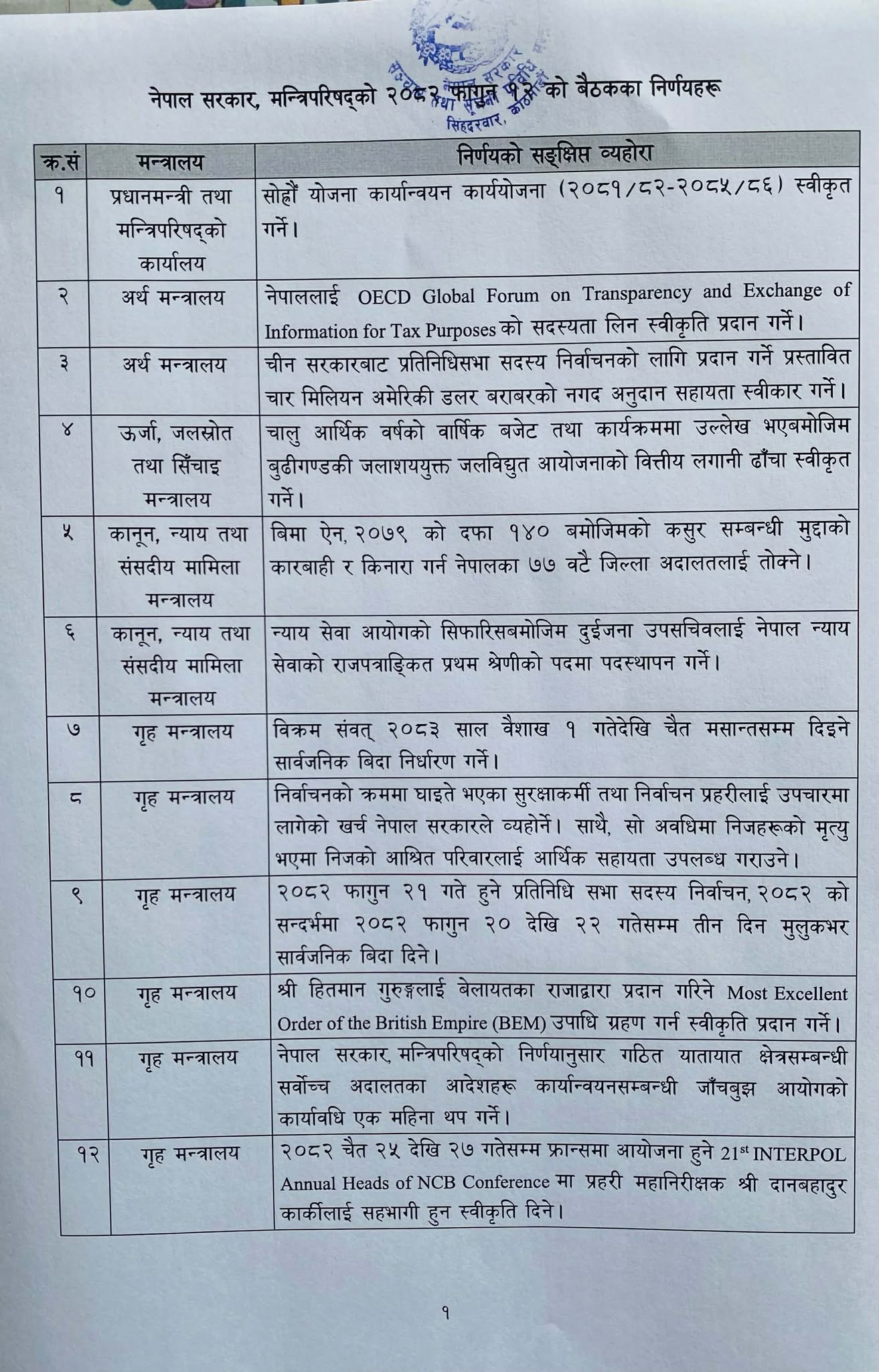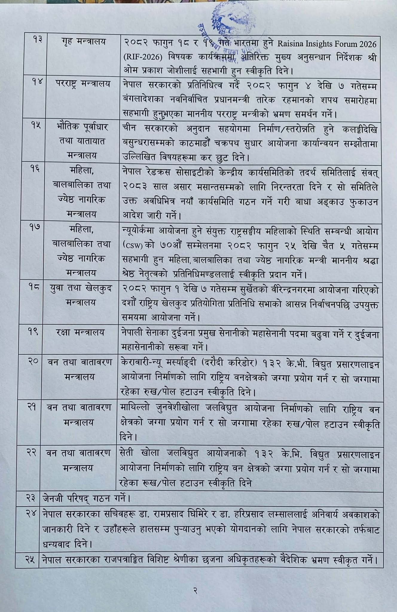 काठमाडौं – गृहमन्त्री ओमप्रकाश अर्यालले मंगलबारको मन्त्रिपरिषद् बैठकका निर्णय सार्वजनिक गरेका छन् । सरकारले चुनावलाई मध्यनजर गर्दै फागुन २०-२२ ३ दिन सार्वजनिक बिदा दिने निर्णय गरेको छ । निर्वाचनको क्रममा घाइते हुने सुरक्षाकर्मी र निर्वाचन प्रहरीको उपचार खर्च नेपाल सरकारले व्यहोर्ने तथा सो अवधिमा मृत्यु भएमा आश्रित परिवारलाई आर्थिक सहायता उपलब्ध गराइने निर्णय पनि गरिएको छ । बैठकले १६ औँ योजना कार्यान्वयन कार्ययोजना (२०८१/८२-२०८५/८६) स्वीकृत गरेको छ । बुढीगण्डकी जलाशययुक्त जलविद्युत् आयोजनाको वित्तीय लगानी ढाँचा स्वीकृत केरावारी-न्यू मर्स्याङ्दी, माथिल्लो जुनवेशीखोला र सेती खोला जलविद्युत् आयोजना निर्माणका लागि राष्ट्रिय वन क्षेत्रको जग्गा प्रयोग गर्न र रुख हटाउन स्वीकृति दिने पनि निर्णय गरिएको छ । हिजै जेनजी परिषद् गठन गर्ने निर्णय पनि गरेको छ ।