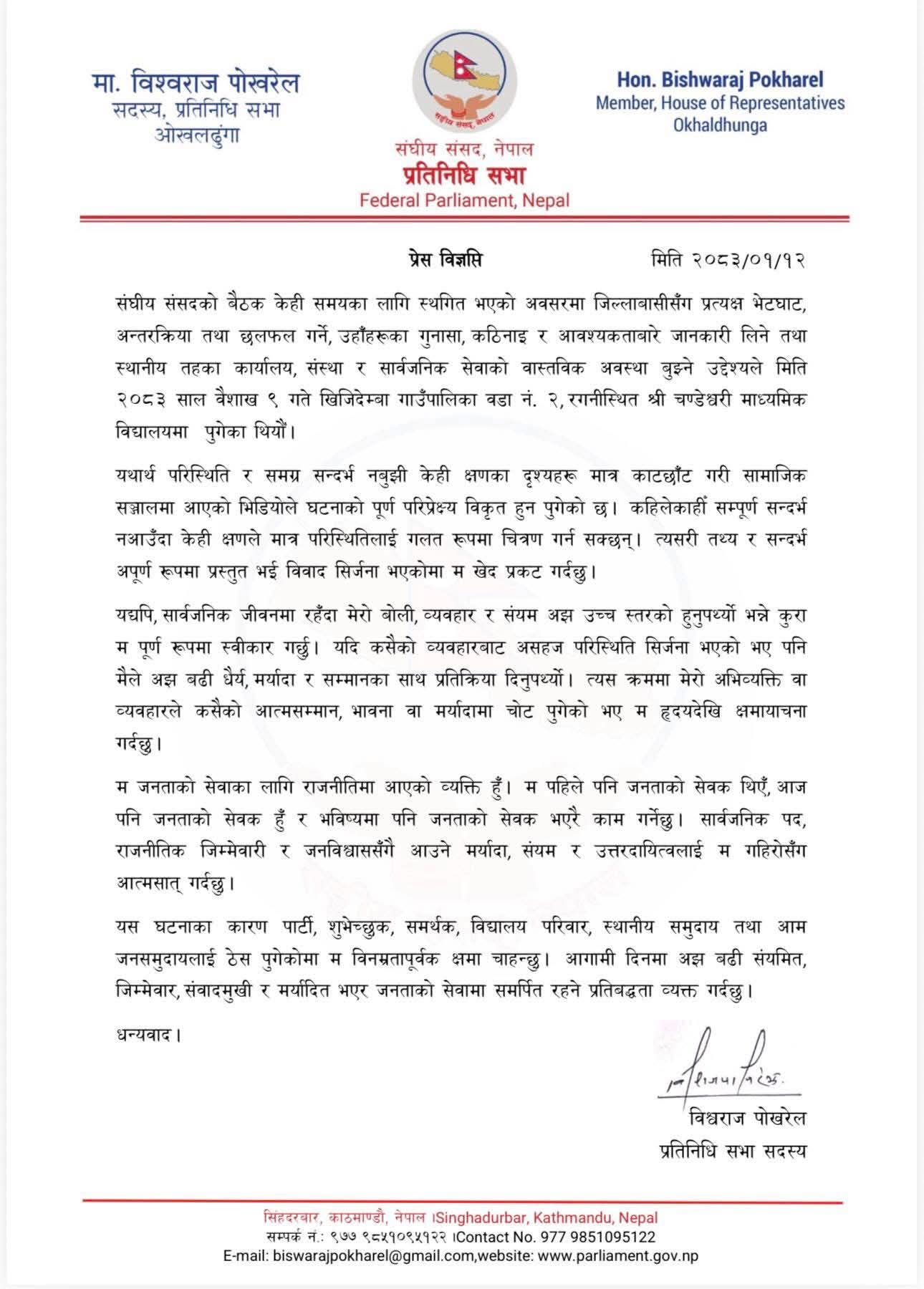 रास्वपा सांसद विश्वराज पोखरेलले मागे माफी