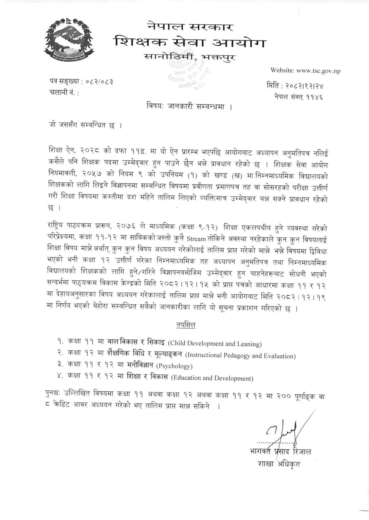 त्यस्तै, कक्षा ११ र १२ मा मनोविज्ञान तथा शिक्षा र विकास अध्ययन गरेकालाई मात्र आयोगले कक्षा ८ सम्म पढाउन लाइसेन्स लिने जनाएको छ । शिक्षा ऐन, २०२८ ले शिक्षक सेवा आयोगबाट अनुमति नलिइ शिक्षक बन्न नपाउने व्यवस्था गरेको छ ।